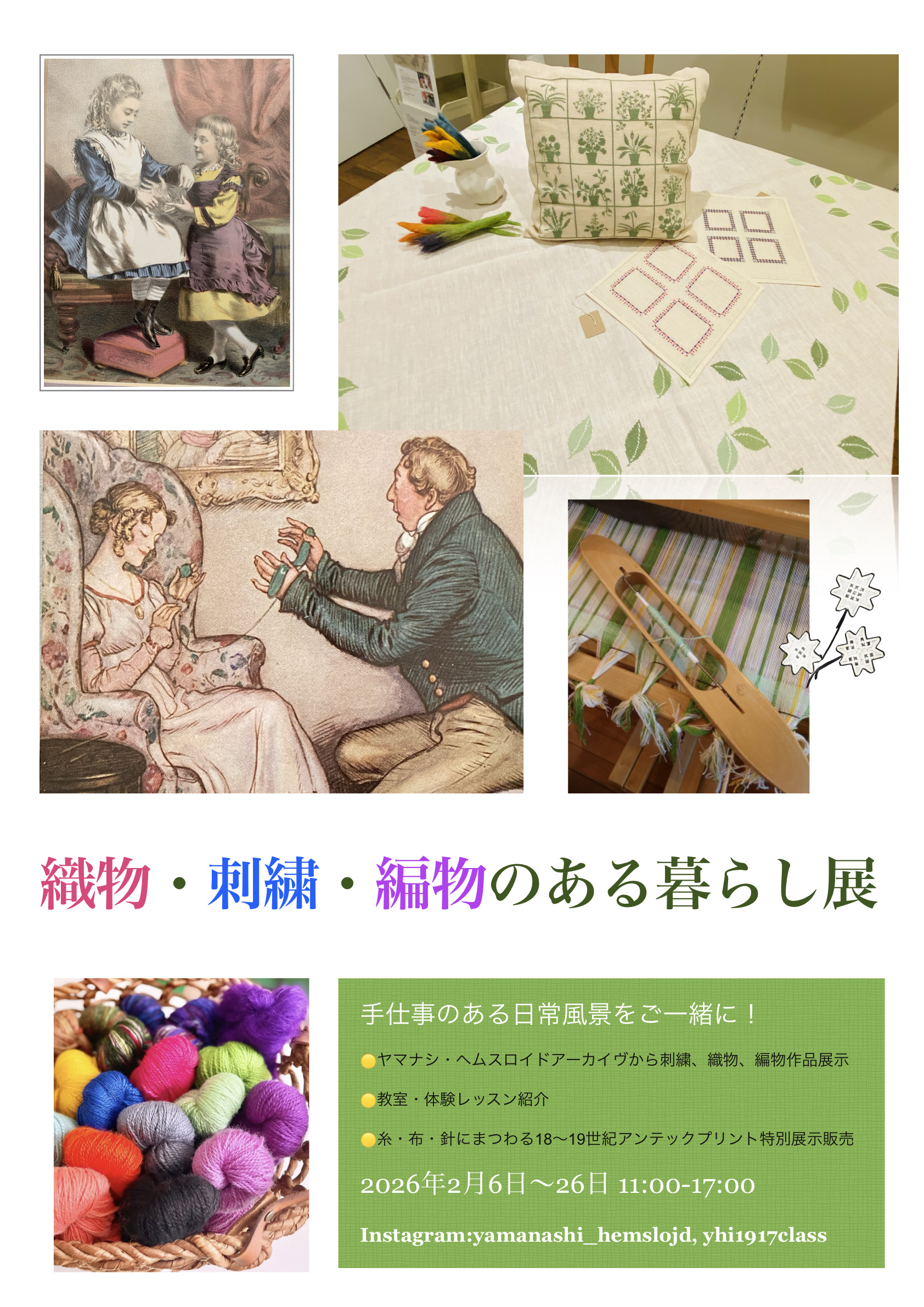 2026/02/18 yhi_member 未分類 No Comments ミモザギャラリー 2026年2月6日(月)~27日(金) 11:00~17:00 (日曜日 休) 手仕事のある日常風景をご一緒に! ヤマナシヘムスロイドアーカイブから織物・刺繍・編物作品を展示いたします。 糸・布・針にまつわる18~19世紀アンティークプリントを特別展示販売。 また各教室・体験レッスンをご紹介しています。