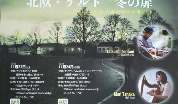 北欧・ケルト 冬の扉 2025/10/16 yhi_member 未分類 No Comments ~アイリッシュハープとニッケルハルパのコンサート~ ミモザギャラリー 2025年11月24日(月祝) 13:00 開場 14:00 開演 料金:予約 35… Read More